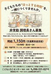 現在、夕食の調理を担当していただける非常勤の調理員さんを募集しています。 特別な資格は必要ありません。子どもたちの笑顔が見たい方、お料理が好きな方をお待ちしています。